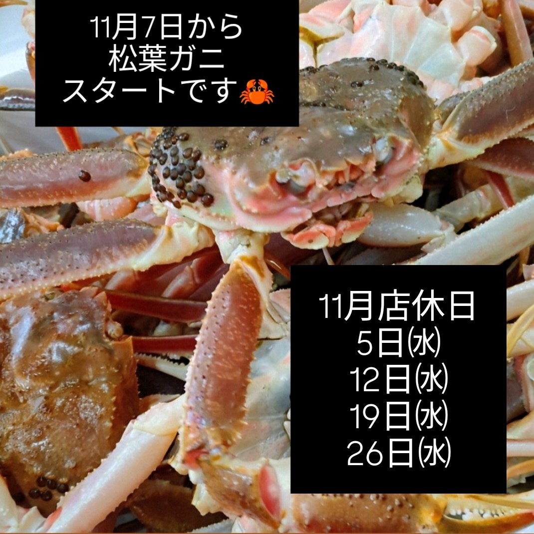 2025.11.01 11月店休日のお知らせです。 11月の店休日は5日(水)、12日(水)、19日(水)、26日(水)になります。 今季の松葉ガニが11月7日よりいよいよスタートします。 11月もよろしくお願いいたします。 前の記事へ 一覧へ
